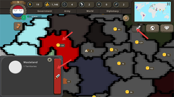 2、在世界地圖上點擊帶有金幣標(biāo)識的區(qū)域,可查看該區(qū)域信息還能選擇用武器圖標(biāo)相關(guān)功能來攻占領(lǐng)地。