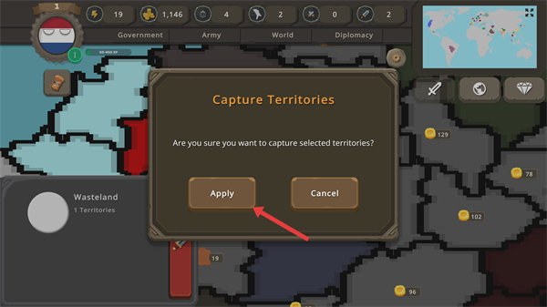3、當(dāng)確定要攻占選中的領(lǐng)地時點擊Apply按鈕確認(rèn)攻占操作,成功后可獲得新領(lǐng)地及相關(guān)資源。