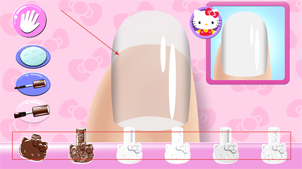 4、在涂好底色的指甲上添加各種裝飾,比如凱蒂貓圖案、閃粉等,完成單個指甲裝飾后,按照同樣的方法處理其他指甲。
