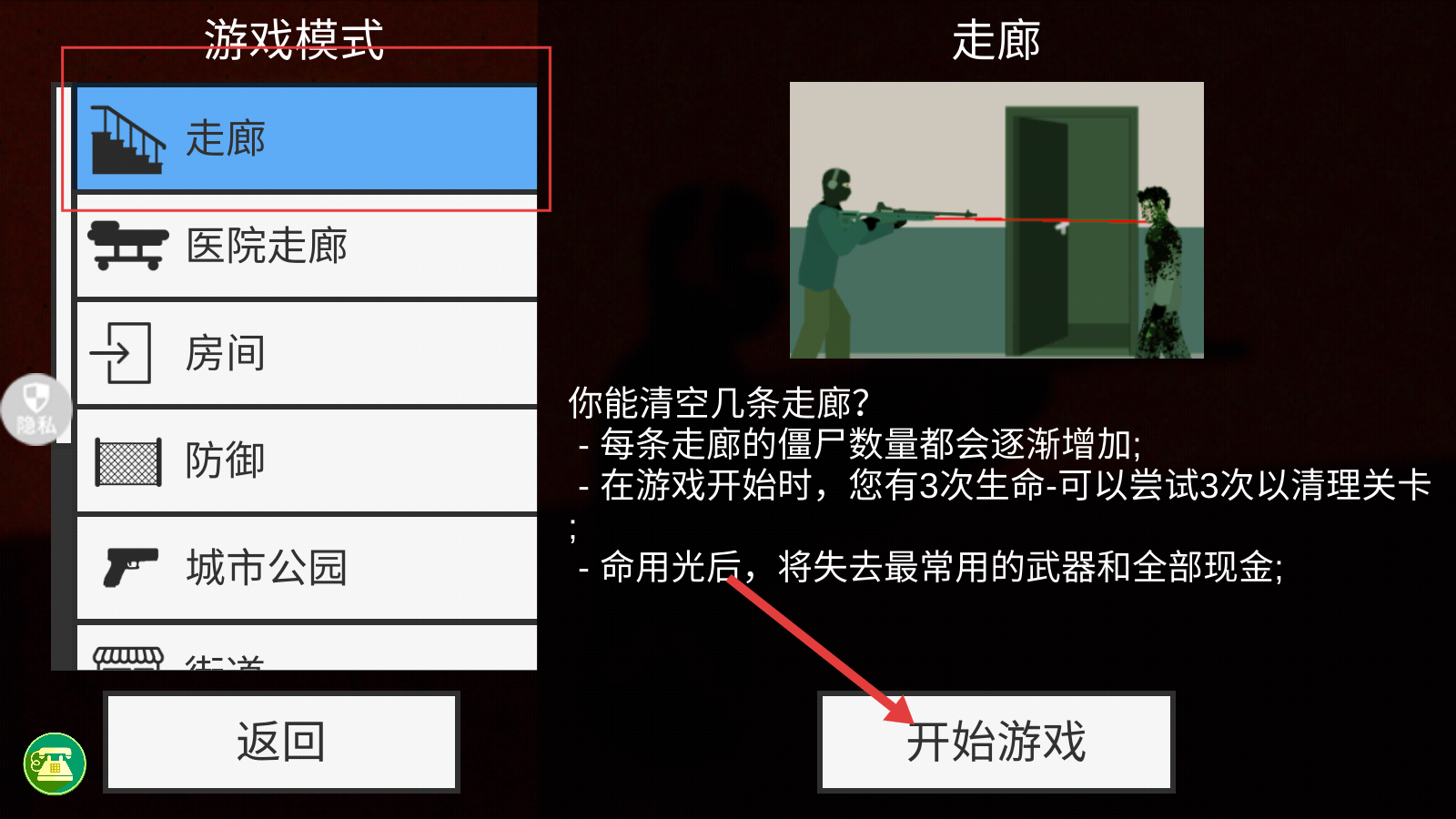2、在游戲模式選擇界面,可挑選走廊、醫(yī)院走廊等不同場景,選好后點擊開始游戲按鈕,就能進入對應(yīng)場景展開射擊。