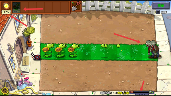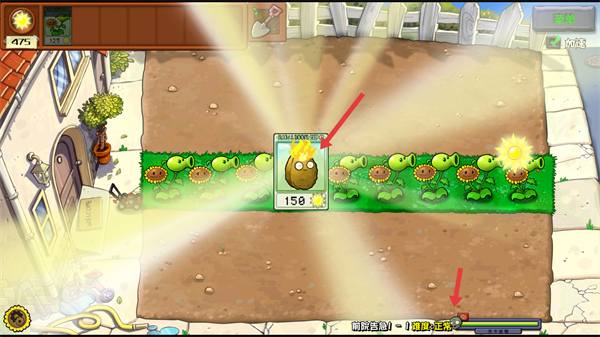 3、利用收集的陽光種植豌豆射手等攻擊型植物,它們能發(fā)射豌豆攻擊僵尸,同時(shí)關(guān)注僵尸波次進(jìn)度做好防御準(zhǔn)備。