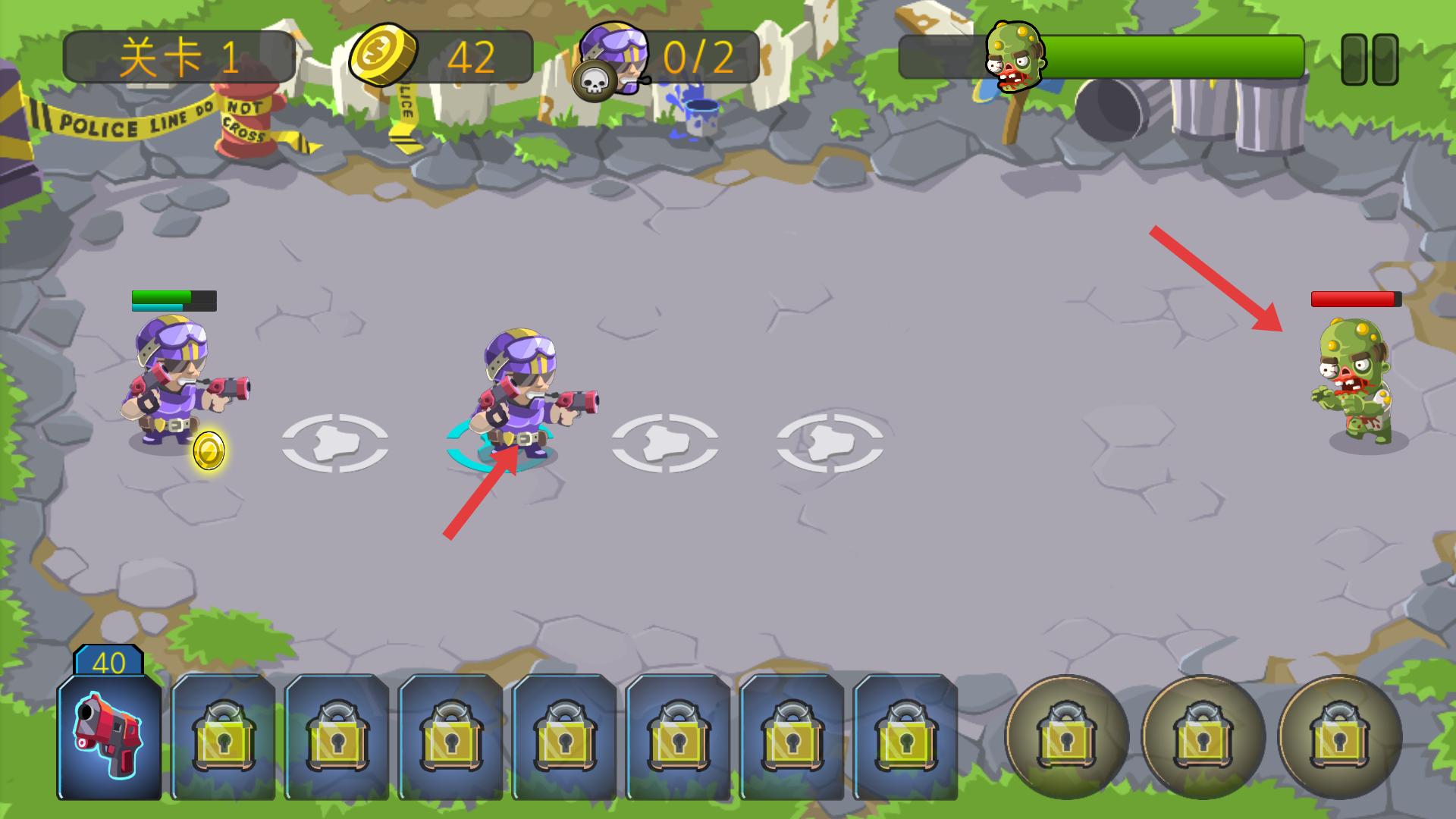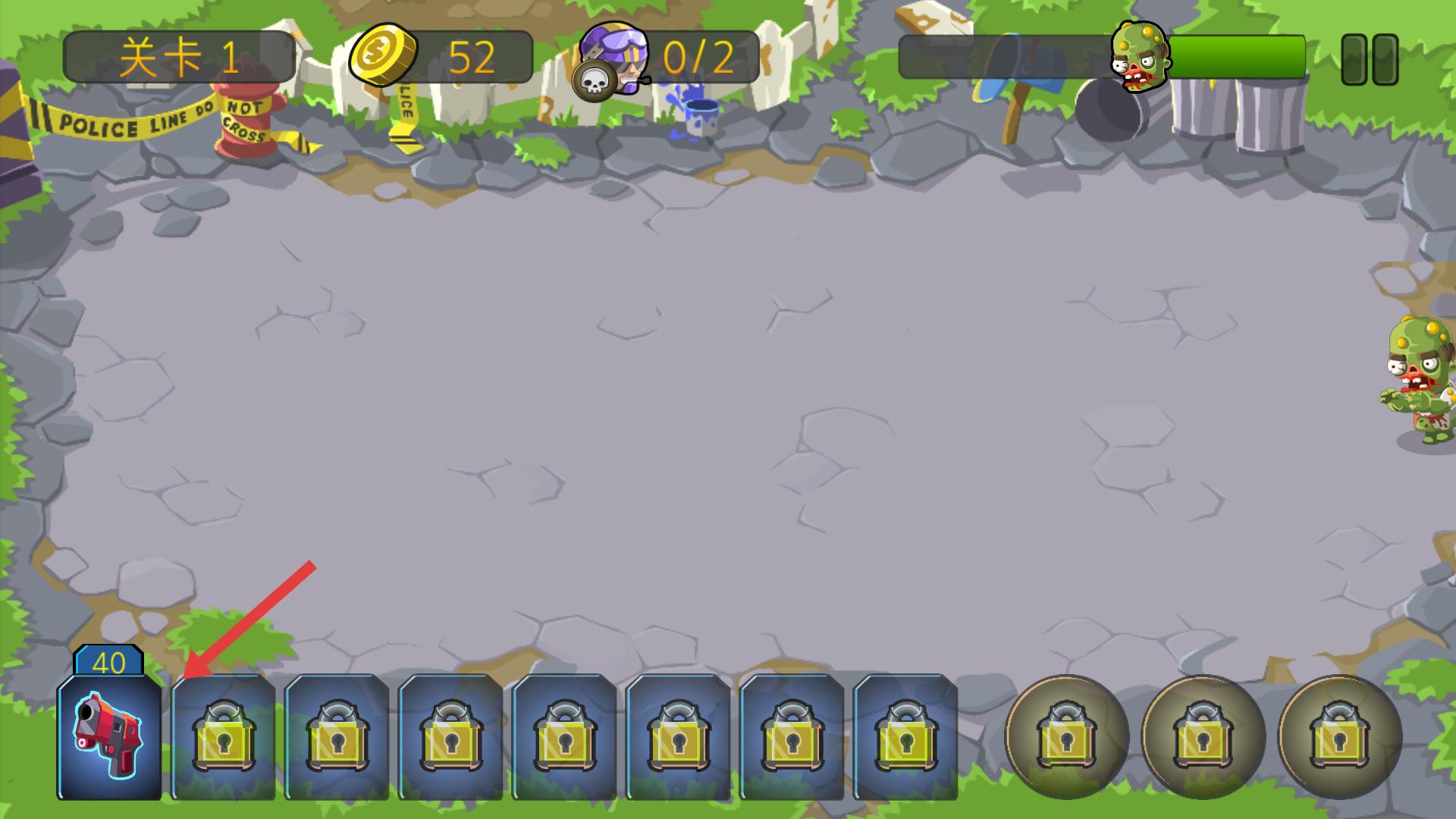 2、進入關卡后,可查看下方武器欄,初始有一把手槍,利用它應對即將出現(xiàn)的僵尸,為戰(zhàn)斗做好準備。
