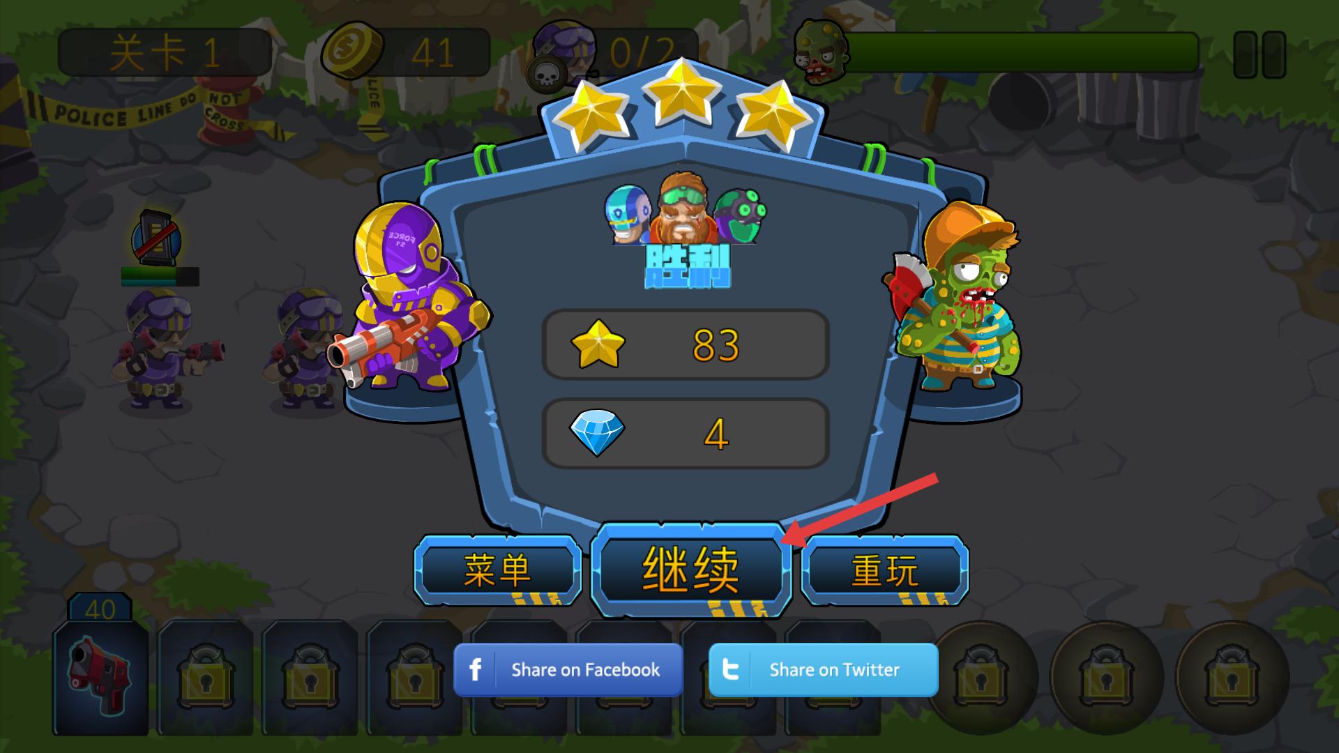 4、成功消滅僵尸,完成關卡后,會獲得星星和鉆石獎勵,點擊繼續(xù),可進入下一關,繼續(xù)挑戰(zhàn)更多僵尸。
