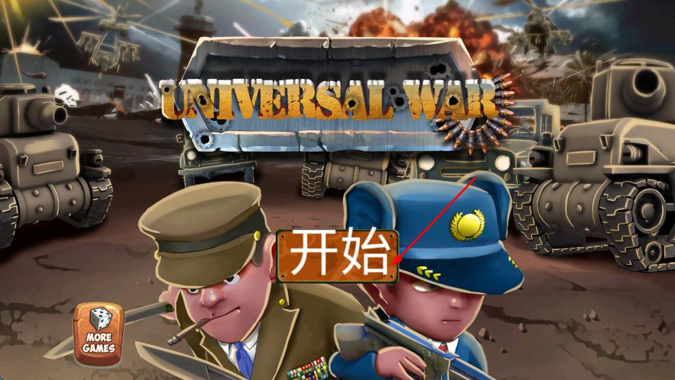 1、啟動(dòng)界面點(diǎn)擊開(kāi)始按鈕進(jìn)入U(xiǎn)niversal War,想嘗試其他游戲可點(diǎn)左下角MORE GAMES,開(kāi)啟游戲旅程。