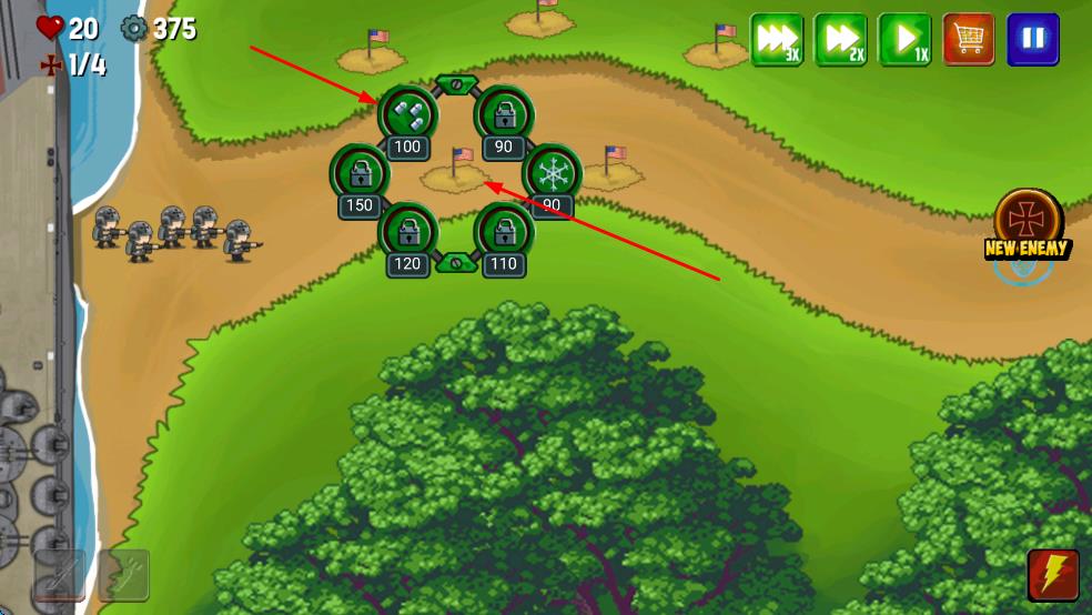1、進(jìn)入關(guān)卡后先觀察敵人進(jìn)攻路線,在關(guān)鍵路徑旁點(diǎn)擊建造基礎(chǔ)機(jī)槍炮塔,形成初始防御陣線阻擋敵人推進(jìn)。