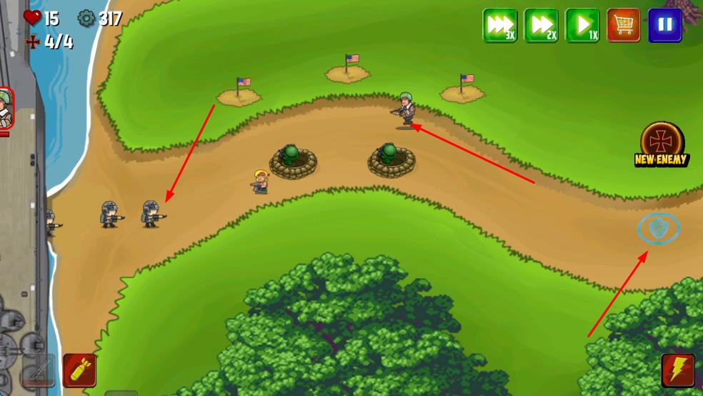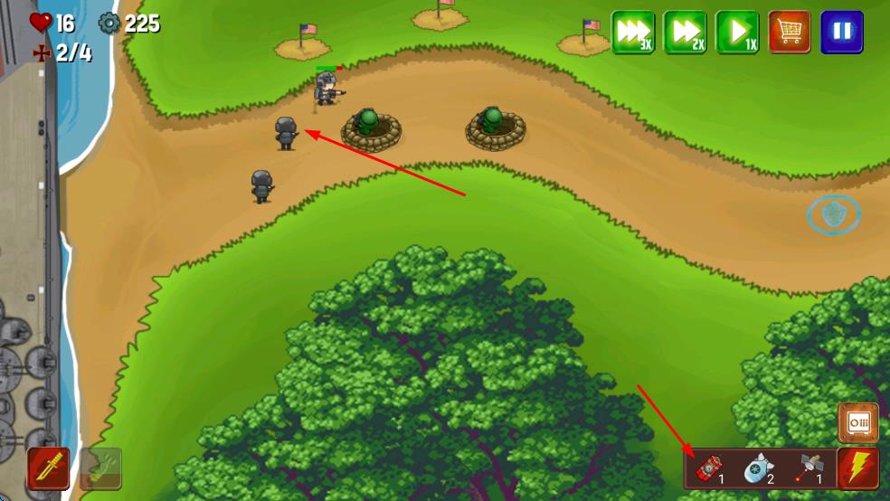 3、戰(zhàn)斗時(shí)緊盯敵人行進(jìn)路線,適時(shí)用右下角火箭等道具攻擊,善用倍速和暫停功能,平衡節(jié)奏與策略。