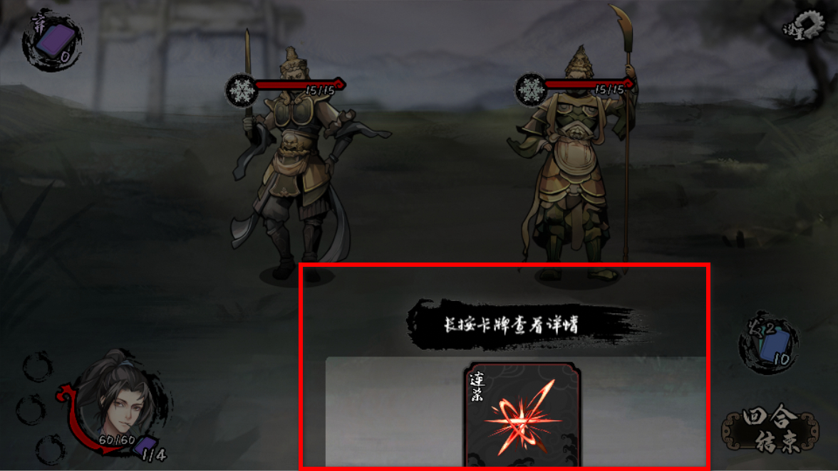 1、戰(zhàn)斗時長按卡牌可查看詳情,了解卡牌的效果和作用,方便在合適的時候使用卡牌,應(yīng)對敵人的進(jìn)攻。