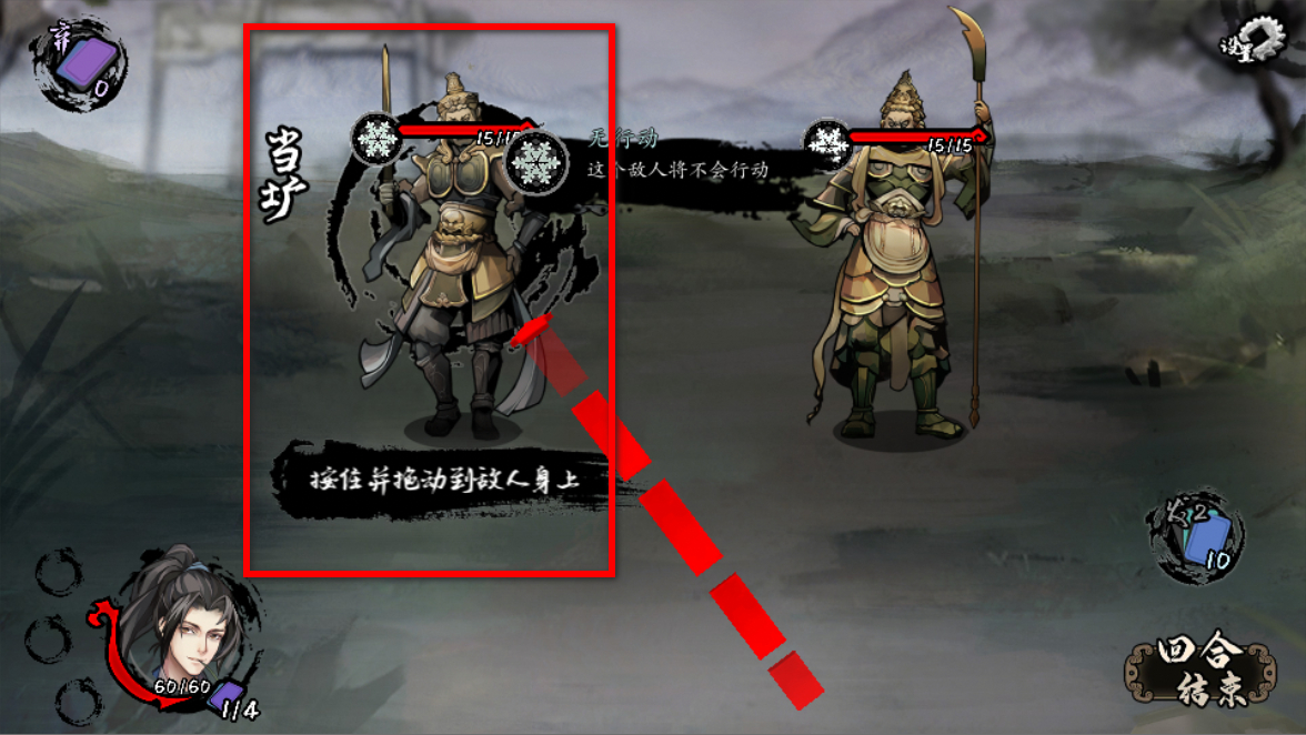 2、使用卡牌時,按住卡牌并拖動到敵人身上,能對敵人釋放卡牌效果,比如讓敵人無法行動,限制敵人的操作。