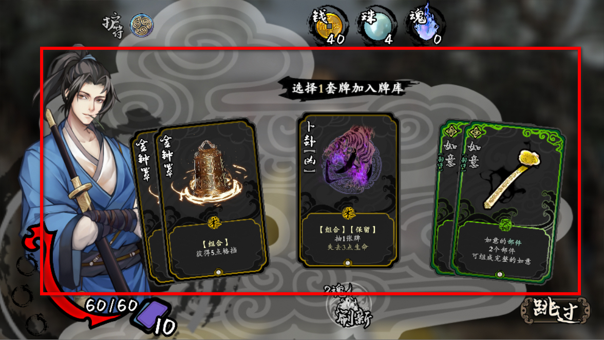 4、能選擇一套牌加入牌庫,不同的牌有不同的效果,選合適的牌加入,能增強自己的戰(zhàn)斗能力,更好地應(yīng)對后續(xù)戰(zhàn)斗。