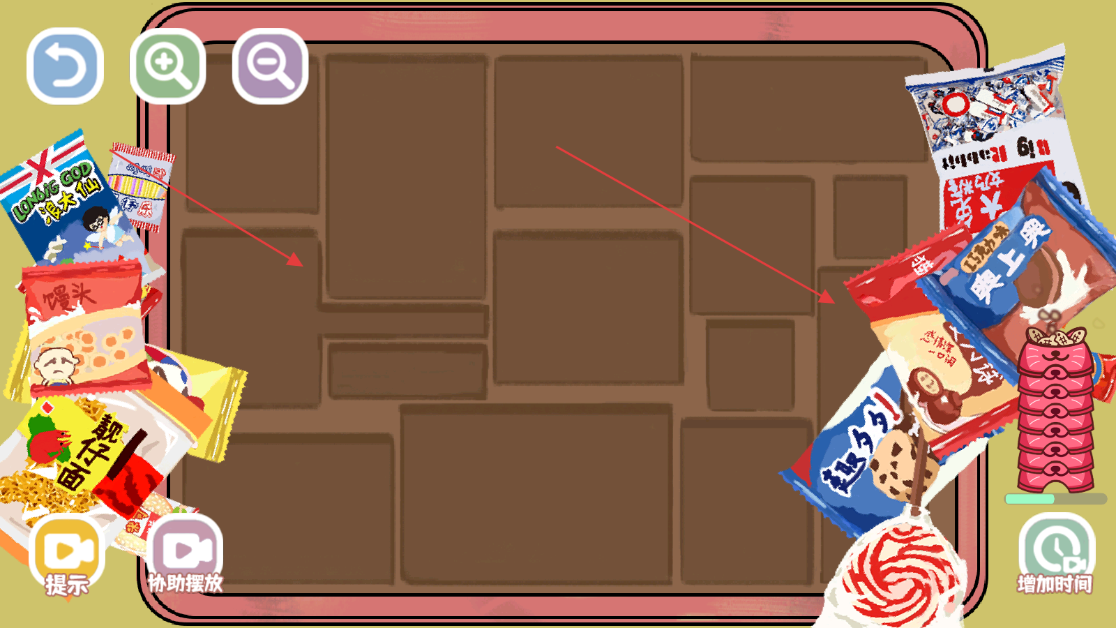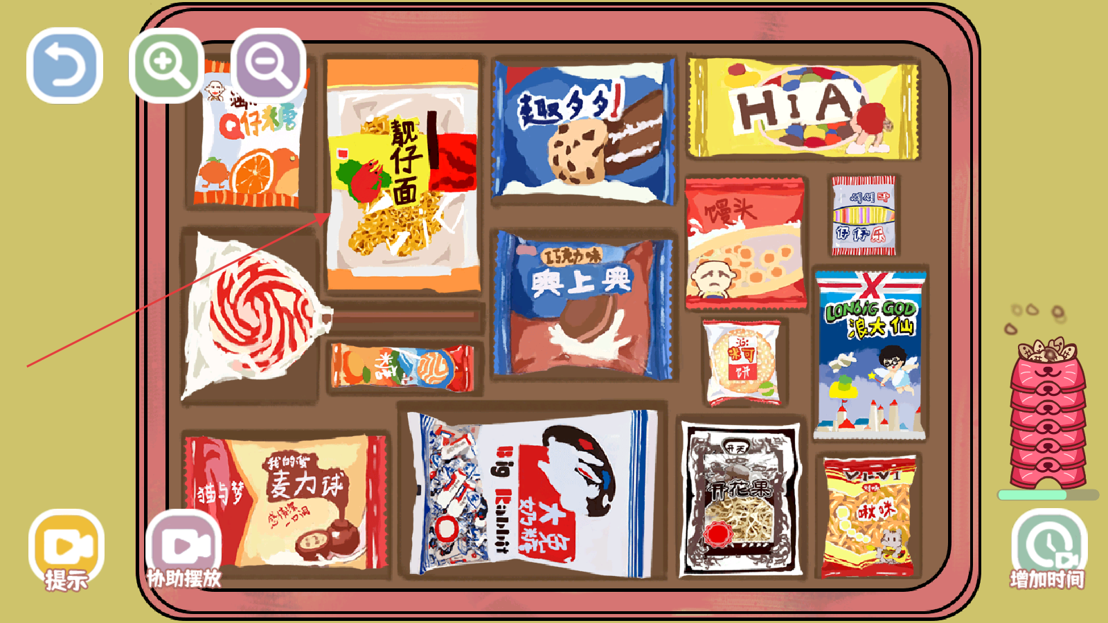 3、進入關卡后通過點擊并拖動物品,將它們放置到合適的收納格子或位置,把各類零食放進對應的格子內(nèi)。