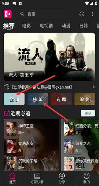 1、進(jìn)入應(yīng)用后可點擊全部按鈕查看近期必追作品,也可通過點擊榜單瀏覽近期熱門電影電視劇作品。