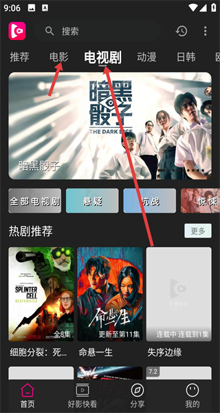 2、想查找電影或電視劇,直接點擊屏幕頂部的電影與電視劇分類,精準(zhǔn)篩選自己想看的內(nèi)容。