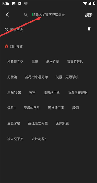 3、利用搜索欄輸入關(guān)鍵字或房間號,能夠快速定位到目標(biāo)電影電視劇節(jié)省查找時間,也可查看熱門搜索挑選好劇。
