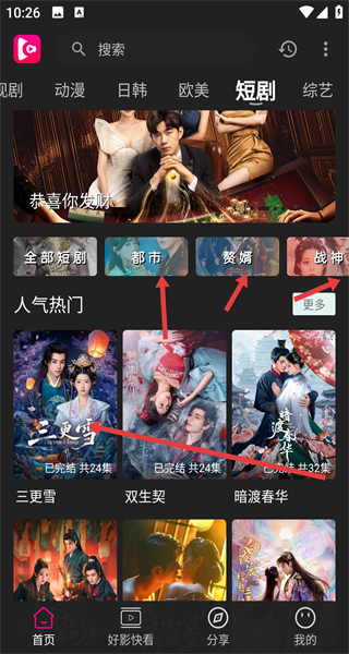 1、進(jìn)入短劇頁面可按需點(diǎn)擊都市贅婿等分類標(biāo)簽,快速篩選對(duì)應(yīng)題材短劇精準(zhǔn)找到想看內(nèi)容。