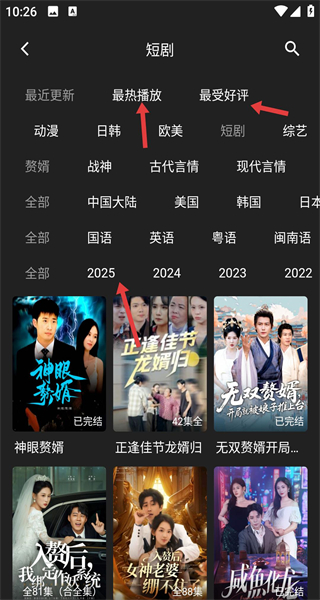 2、在短劇頁面切換最熱播放和最受好評(píng)等榜單或選2025等年份,能夠按熱度評(píng)價(jià)年份找心儀短劇。