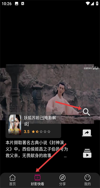 3、看到感興趣內(nèi)容點(diǎn)擊播放頁搜索圖標(biāo)能快速查找相關(guān)影視,也可從好影快看入口發(fā)現(xiàn)更多精選作品。
