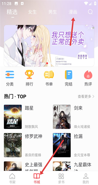 1、進入書城點擊頂部漫畫切換板塊可瀏覽漫畫資源,利用分類排行等快速找想看的漫畫作品。