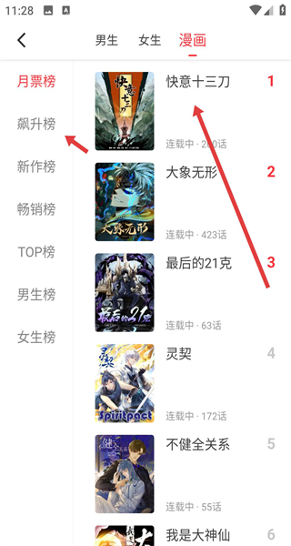 3、進入漫畫排行頁面選飆升榜等榜單,找到快意十三刀等作品點擊即可查看詳情按榜單找熱門漫畫。
