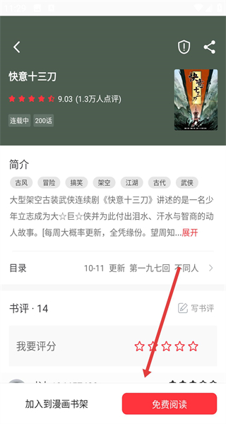 4、找到目標(biāo)漫畫快意十三刀可進行查看簡介評分,點擊免費閱讀開始觀看也可加入書架方便后續(xù)追更。