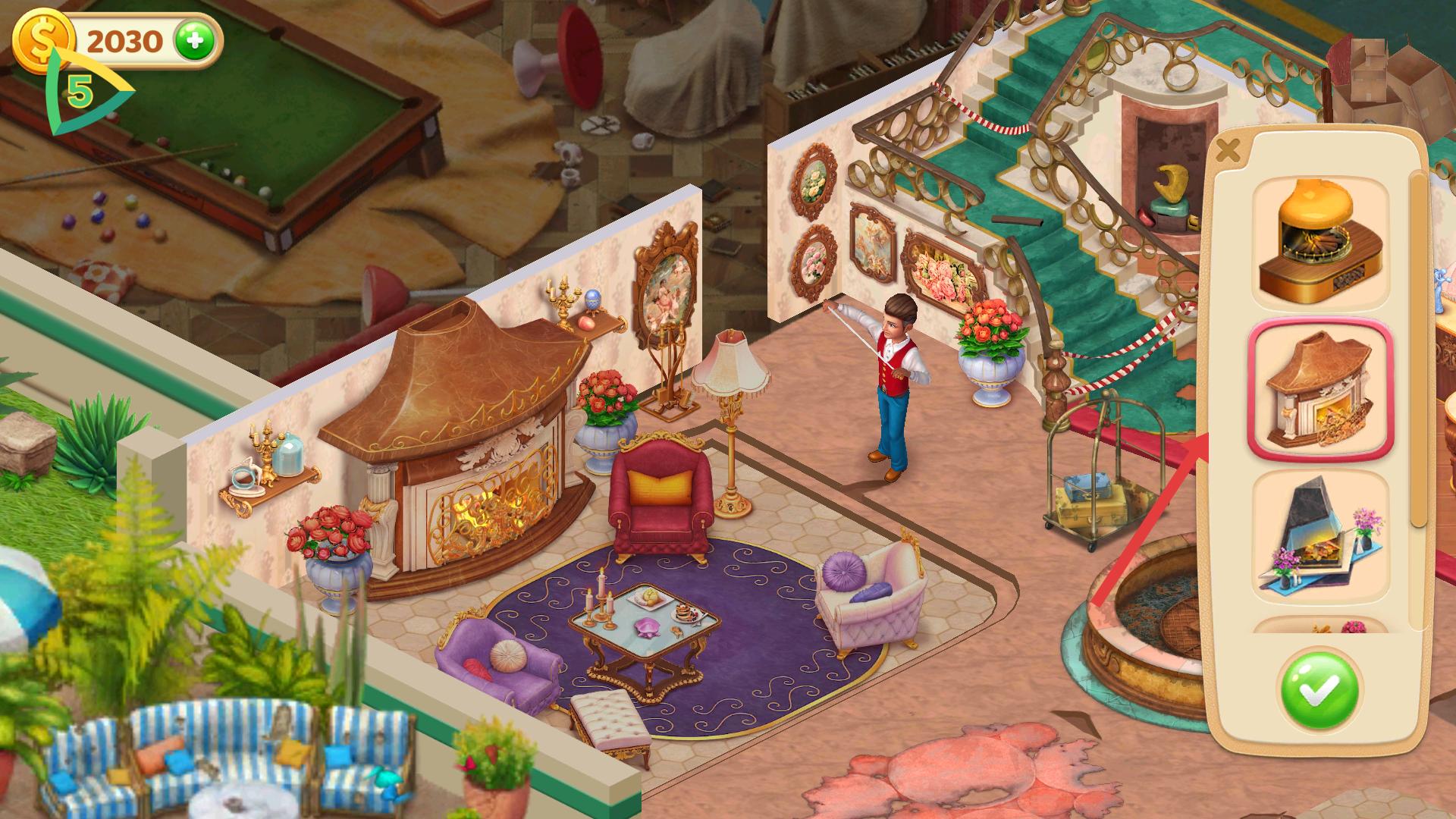4、修理壁爐時,右側(cè)會出現(xiàn)壁爐樣式選擇欄,挑選心儀的壁爐樣式后,點擊綠色對勾按鈕,完成壁爐修理與樣式設(shè)置。
