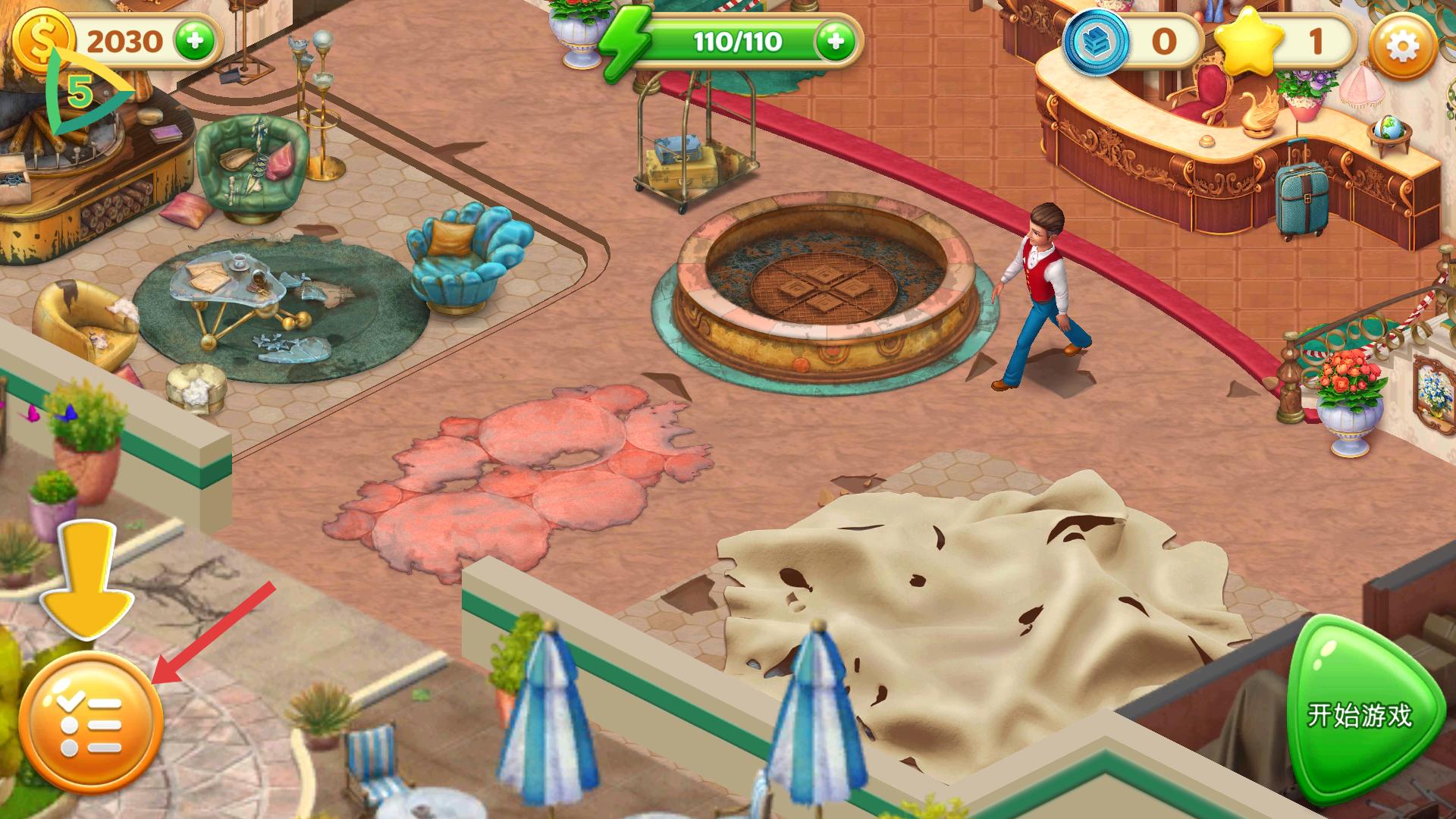 1、點擊綠色的開始游戲按鈕,即可進(jìn)入游戲,開啟在酒店場景中的探索之旅。
