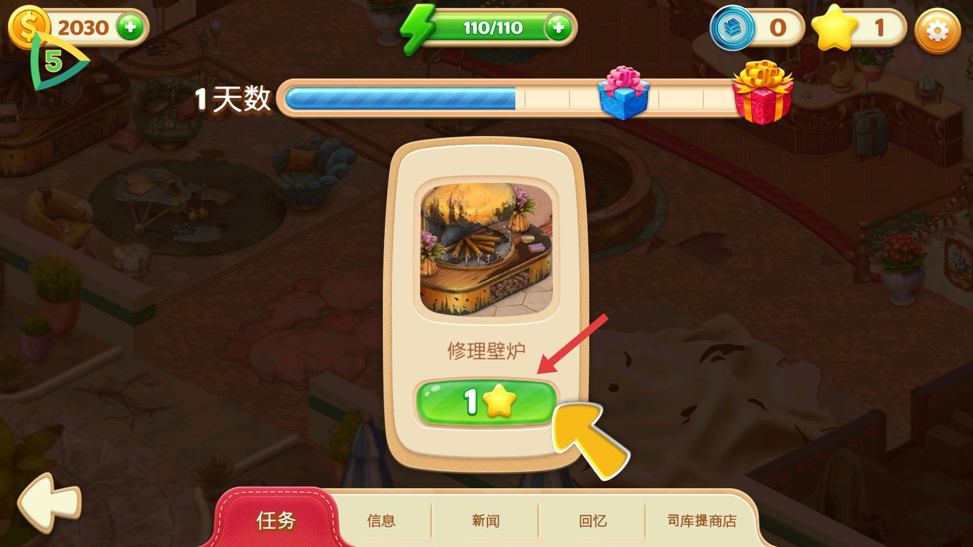 3、在任務(wù)界面,能看到修理壁爐任務(wù),點擊標(biāo)有1星的綠色按鈕,可開始進(jìn)行壁爐修理工作。