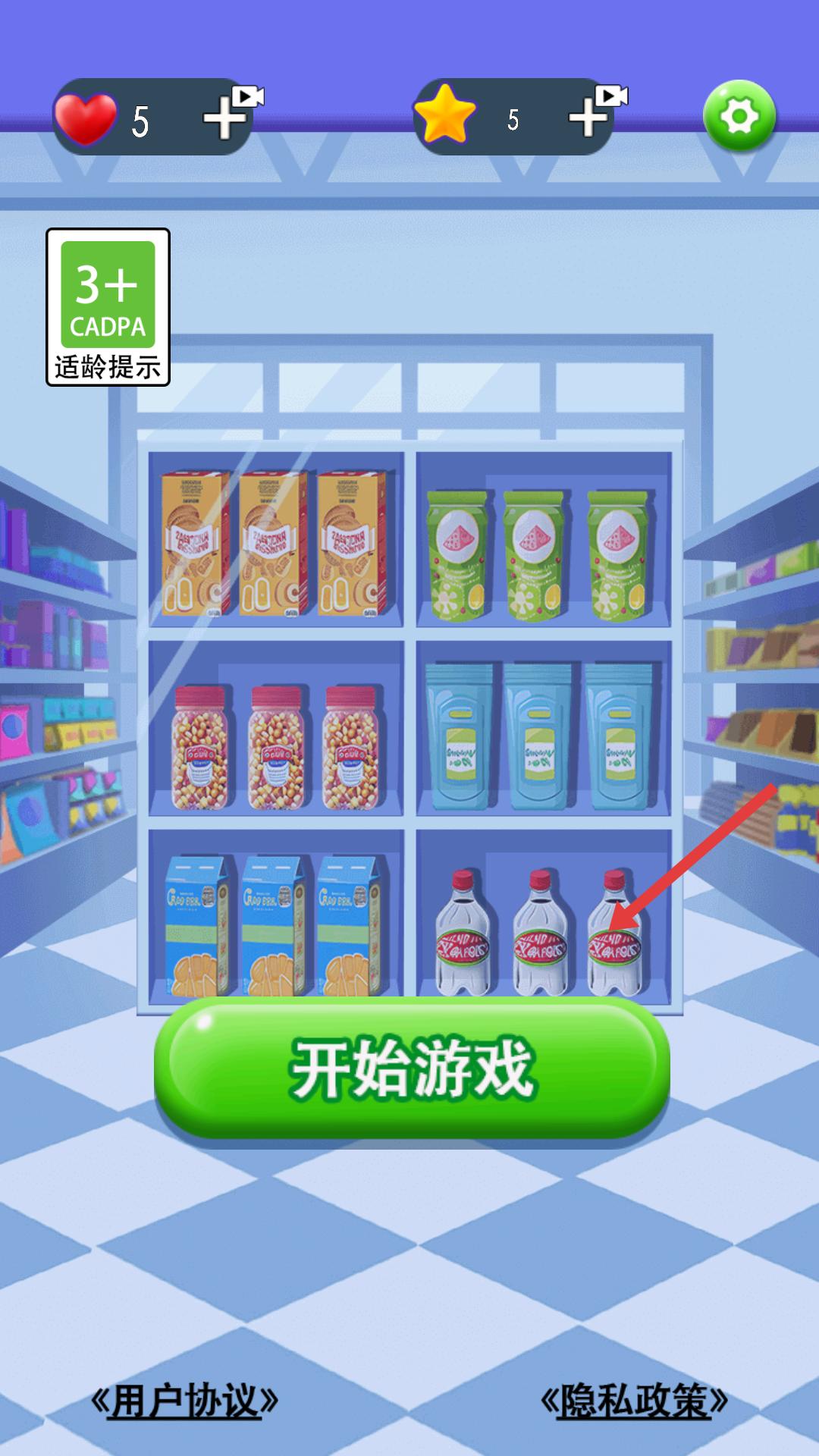 1、進(jìn)入游戲,能看到貨架上擺滿各類商品,點(diǎn)擊開始游戲,即可開啟超市內(nèi)的消除挑戰(zhàn),準(zhǔn)備體驗趣味玩法。