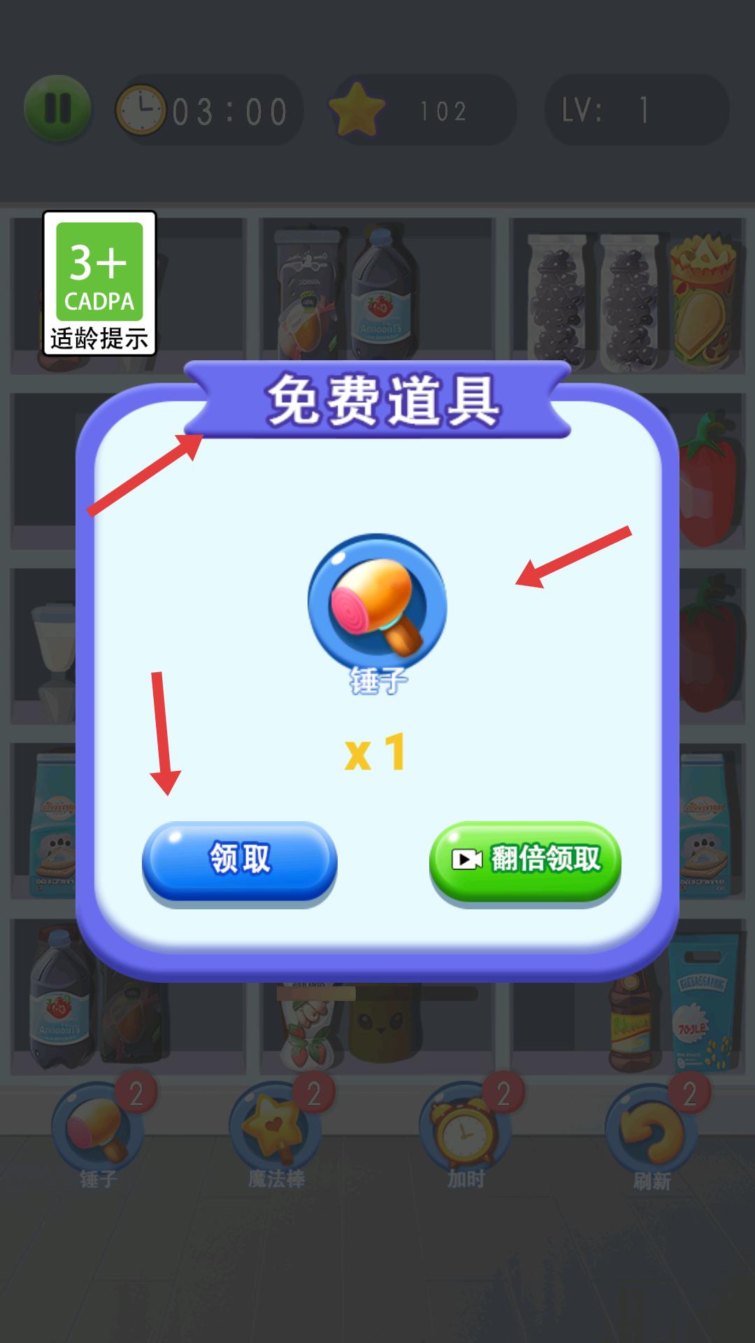 2、游戲中會彈出道具窗口,可選擇領(lǐng)取錘子道具,也能通過看視頻翻倍領(lǐng)取,獲得道具助力消除。