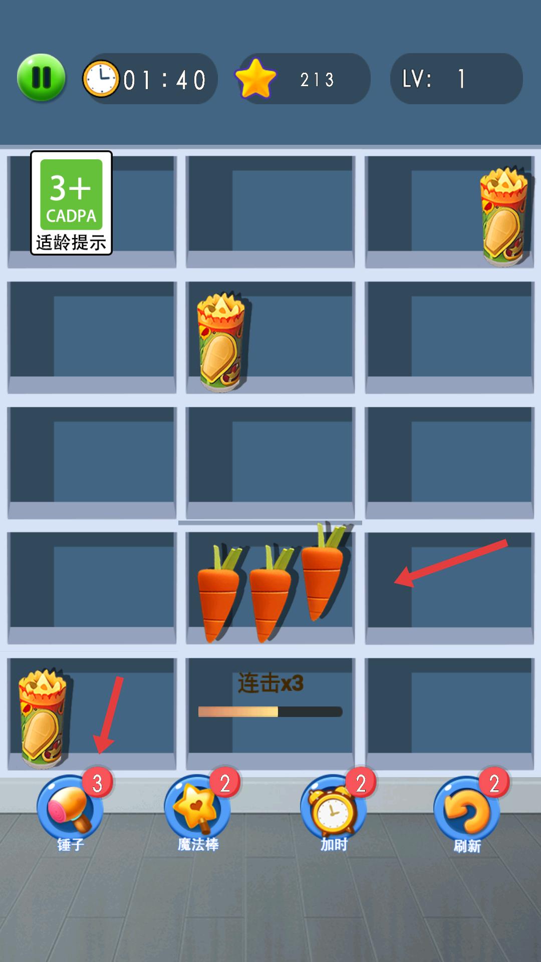 3、在消除界面里,貨架上有不同商品,可點(diǎn)擊相同商品進(jìn)行消除,還能使用錘子等道具,快速清理商品推進(jìn)游戲。