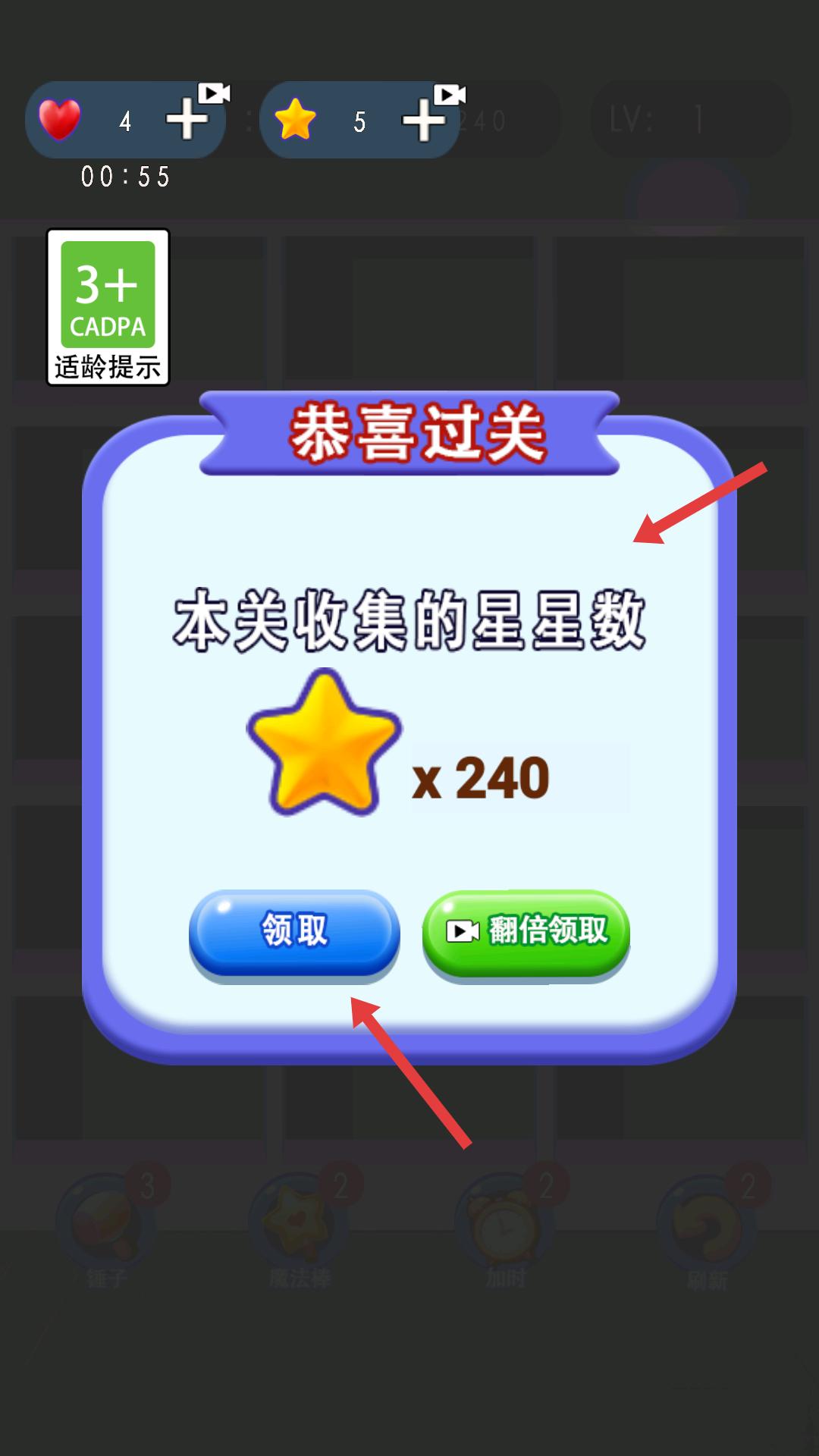 4、成功通關(guān)后,會顯示恭喜過關(guān)界面,能看到本關(guān)收集的星星數(shù),點(diǎn)擊領(lǐng)取可獲得星星,也可看視頻翻倍領(lǐng)取。