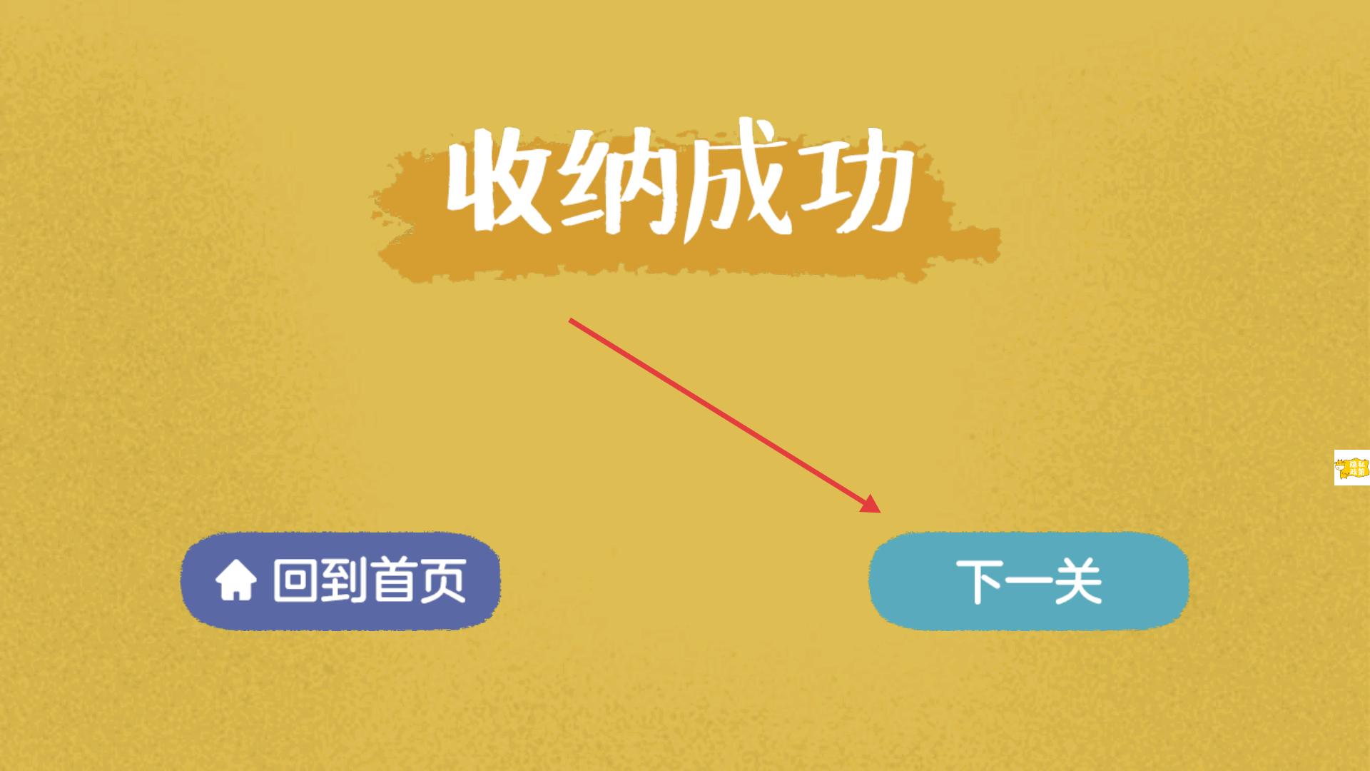 4、當(dāng)所有物品都妥善收納后,會顯示收納成功,此時可點(diǎn)擊下一關(guān),繼續(xù)挑戰(zhàn)新的收納關(guān)卡。