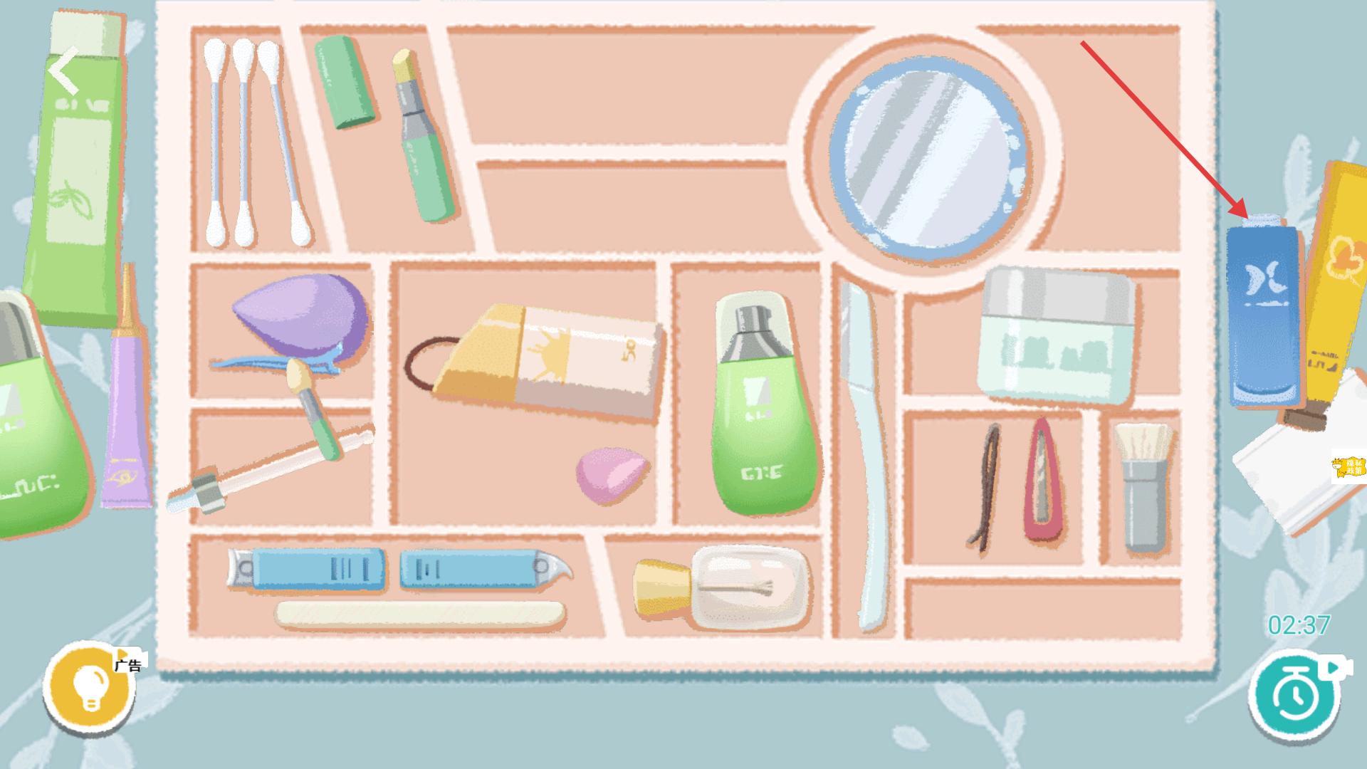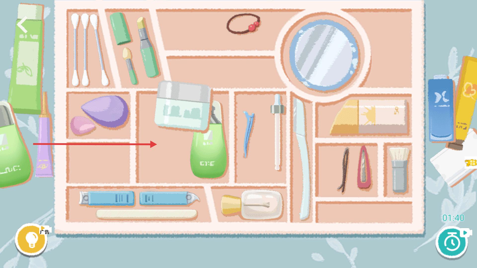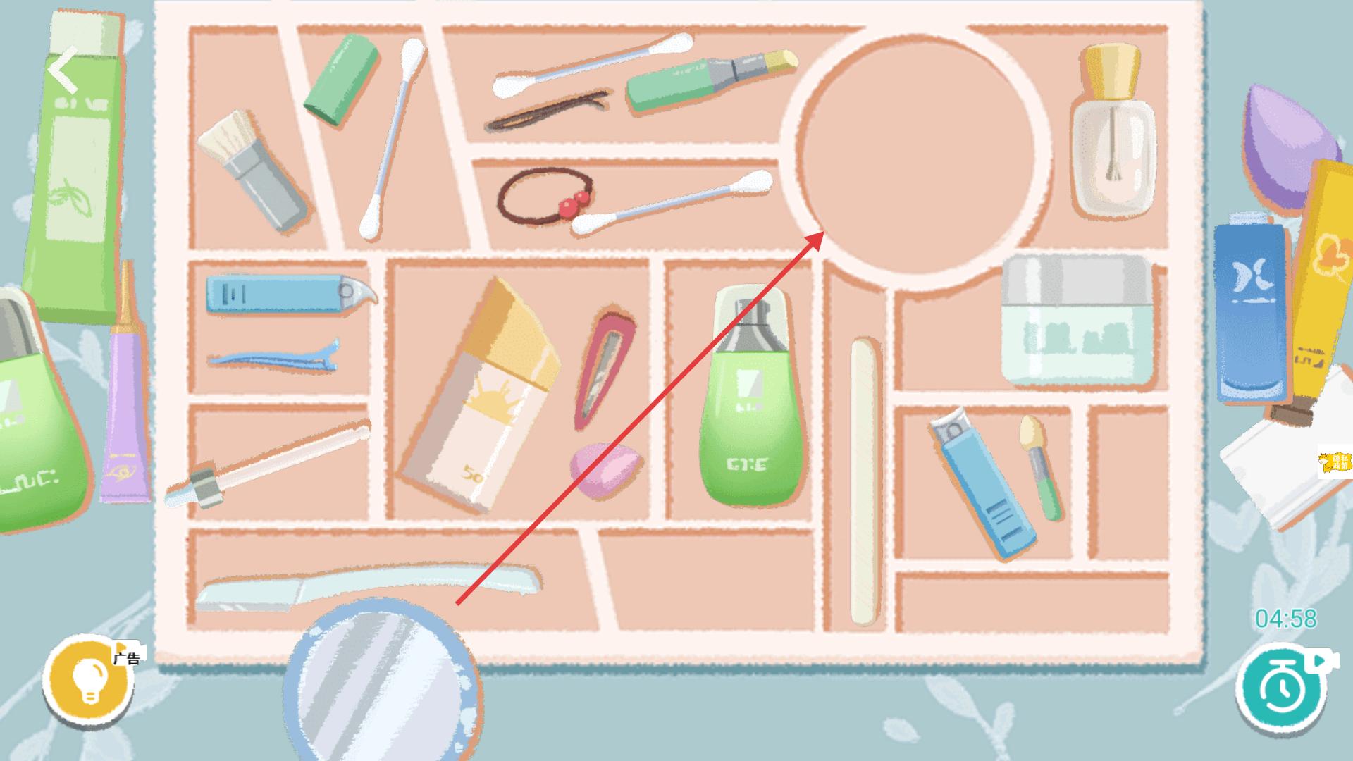 1、游戲開始,先觀察收納盒內(nèi)物品分布,將圓形鏡子拖入對應(yīng)圓形空位,為后續(xù)收納其他物品騰出合適空間。