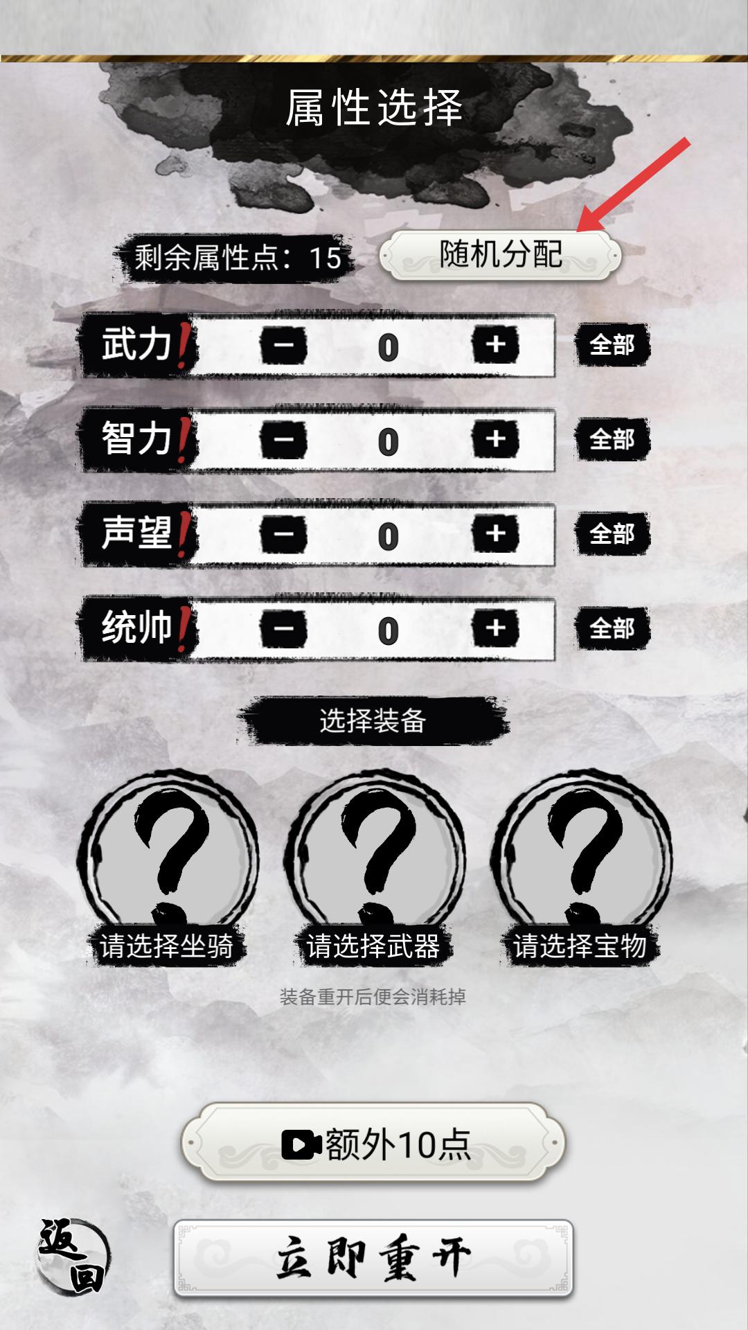 2、進入屬性選擇界面,有武力、智力等屬性,剩余15點屬性點,可點擊隨機分配按鈕,讓系統(tǒng)隨機分配屬性點,也可手動調(diào)整。
