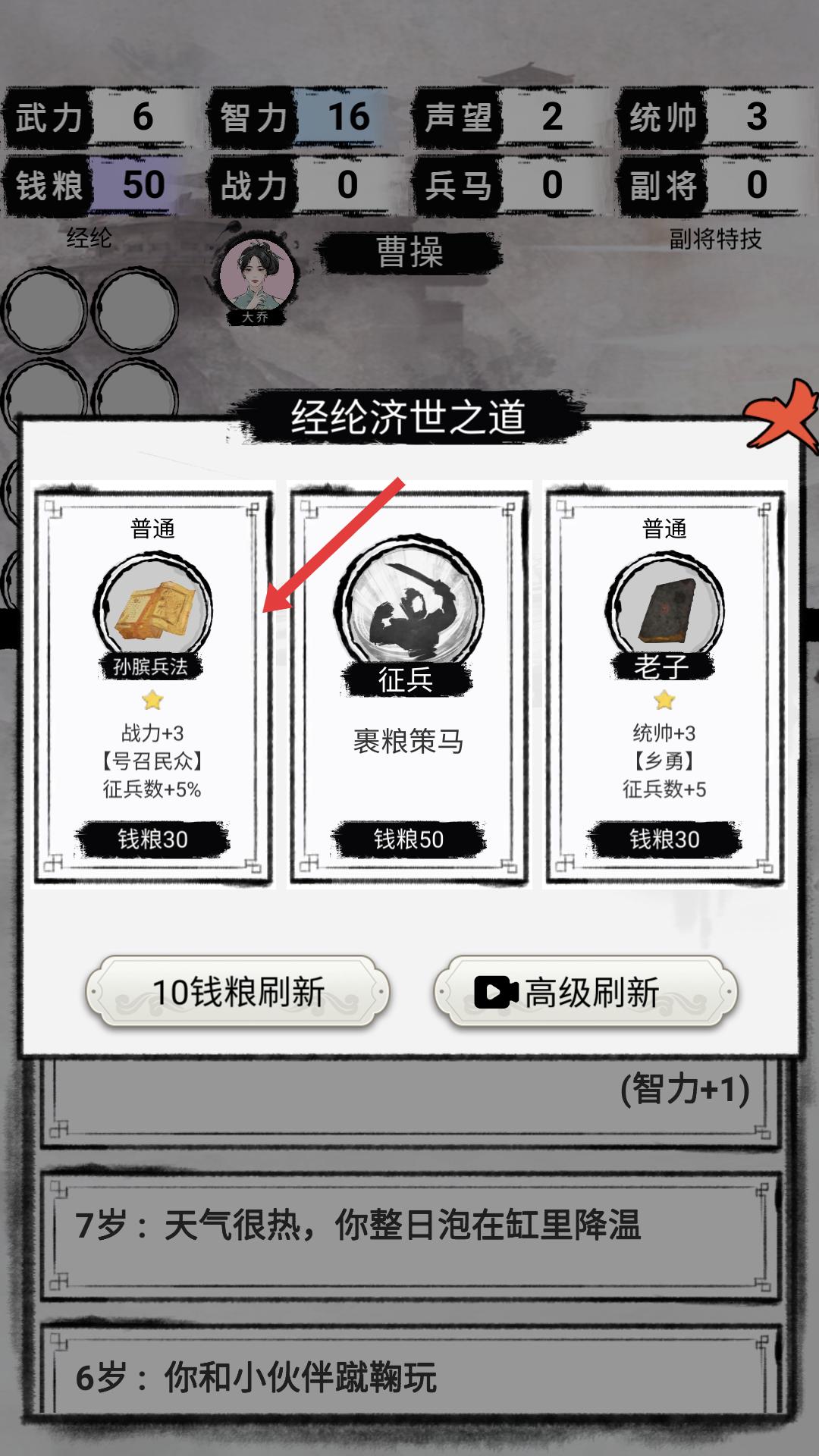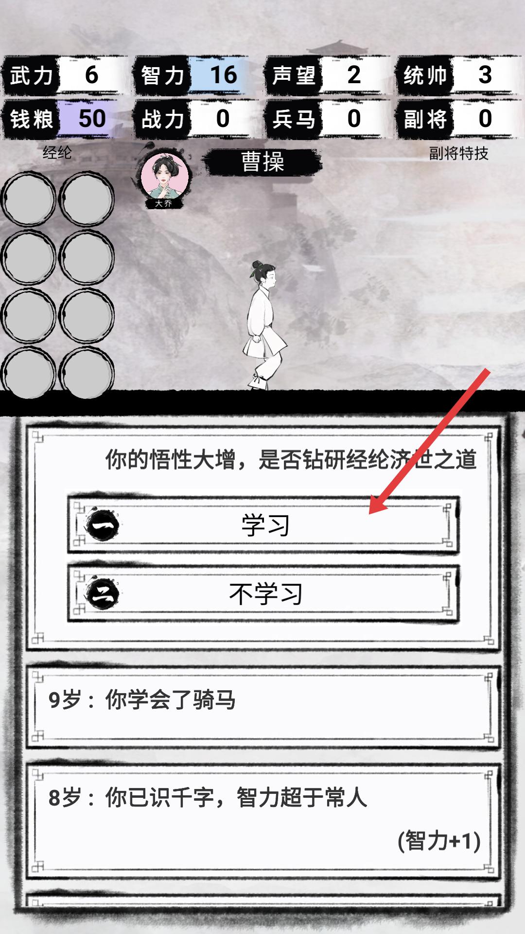 3、游戲過程中會出現(xiàn)選擇,若想提升相關能力,可點擊學習選項,推動角色成長。
