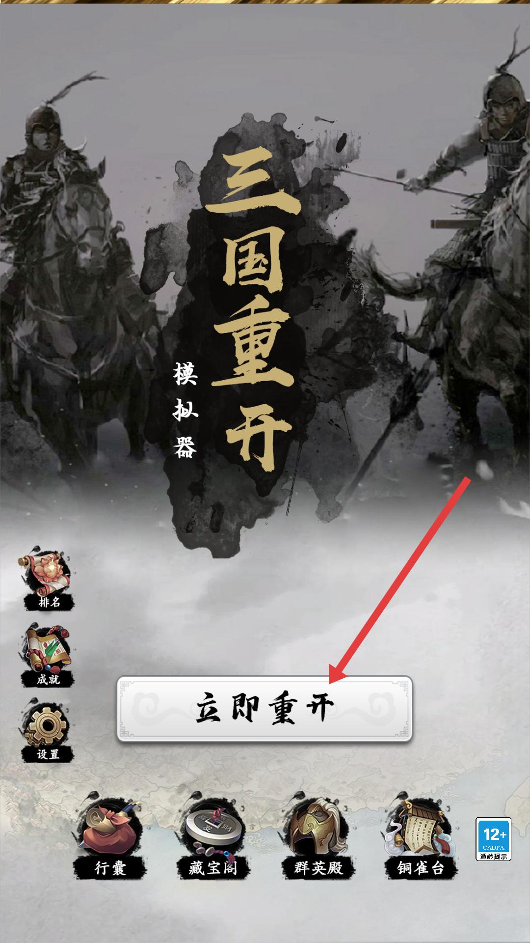 1、游戲界面有三國重開模擬器字樣,下方有立即重開按鈕,點擊該按鈕,即可開啟三國重開的模擬之旅。
