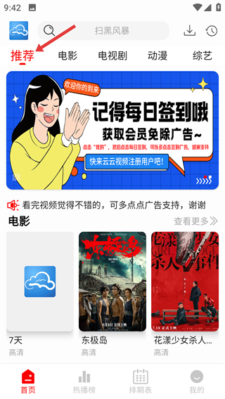 2、進(jìn)入首頁(yè)的推薦板塊這里有各類推薦影視,還有每日簽到獲取會(huì)員免廣告等活動(dòng)可挑選感興趣的內(nèi)容觀看。