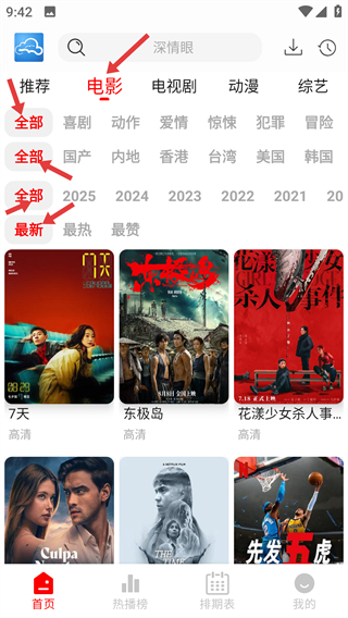 3、在電影分類下通過(guò)全部類型,地區(qū),年份及最新排序等篩選條件,能精準(zhǔn)找到想要觀看的電影。