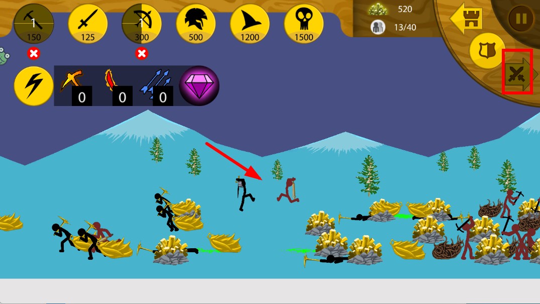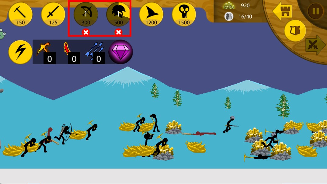 4、根據(jù)戰(zhàn)斗需求,點(diǎn)擊上方不同兵種圖標(biāo),可召喚相應(yīng)的火柴人士兵,如弓箭手、持盾戰(zhàn)士等,壯大己方戰(zhàn)斗力量,助力取得勝利。