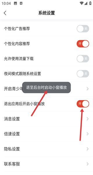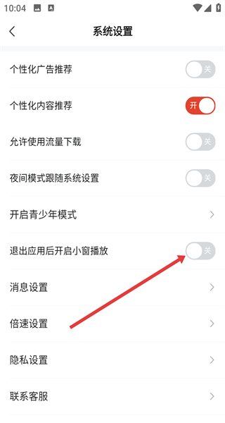 4、找到退出應(yīng)用后開啟小窗播放選項(xiàng)后,點(diǎn)擊其右側(cè)的開關(guān)按鈕,將其開啟,這樣退出應(yīng)用后就會(huì)啟動(dòng)小窗播放。