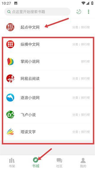 1、在書城頁面有起點(diǎn)中文網(wǎng),縱橫中文網(wǎng)等多個(gè)小說平臺,可根據(jù)喜好選擇平臺進(jìn)入后還能查看分類和排行榜找書。