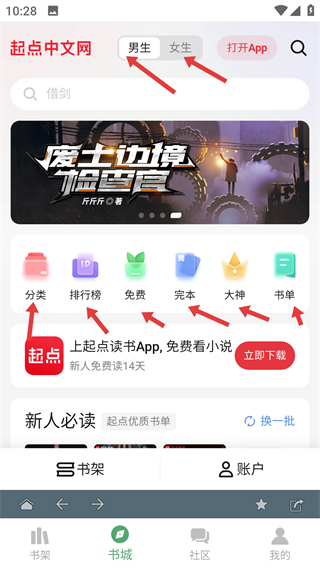 2、進(jìn)入起點(diǎn)中文網(wǎng)可切換男生,女生頻道利用分類,排行榜,免費(fèi)等功能快速找到想看的小說也可直接搜索。
