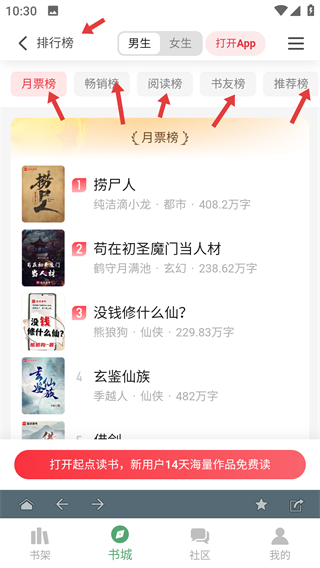 3、在排行榜頁面有月票榜,暢銷榜等多種榜,單切換不同榜單能了解熱門小說挑選感興趣的閱讀。