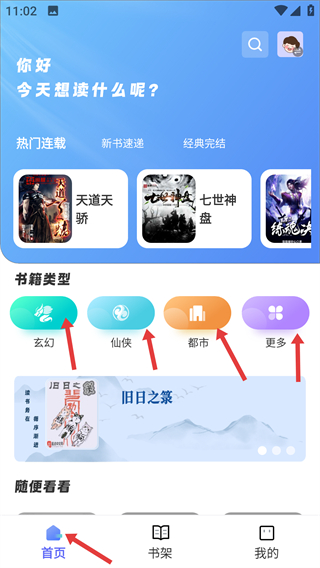 1、在首頁可看到熱門連載等板塊和玄幻,仙俠等書籍類型,能直接挑選感興趣的書籍閱讀也可點擊更多探索其他類型。
