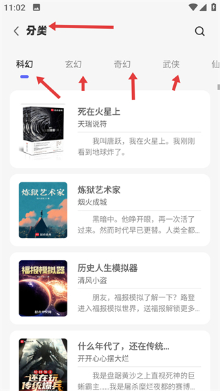 2、進(jìn)入分類頁面有科幻,玄幻等多種分類,切換不同分類可查看對應(yīng)類別的書籍快速找到想看的作品。