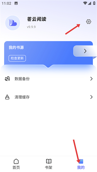 4、點擊我的進(jìn)入個人頁面可點擊設(shè)置圖標(biāo),還能進(jìn)行數(shù)據(jù)備份清理緩存等操作管理閱讀相關(guān)設(shè)置。