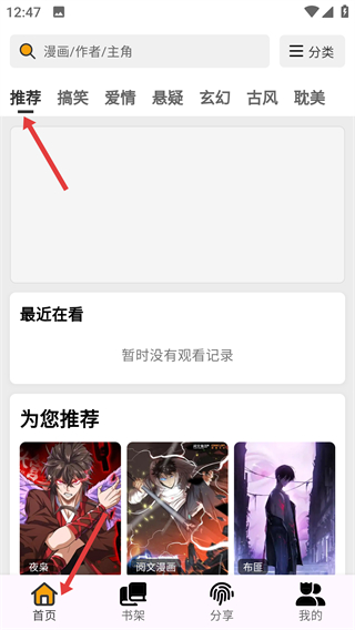 1、在首頁有推薦,搞笑等分類還有最近在看和為您推薦板塊,可直接挑選感興趣的漫畫也能通過搜索欄查找。