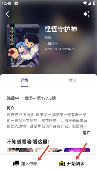 3、找到喜歡的漫畫后可查看其詳情和章節(jié),點擊加入書架方便后續(xù)查找,點擊開始閱讀即可開始看漫畫。