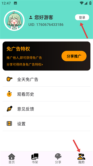 4、點擊我的可進行登錄,登錄后能享受免廣告特權(quán)還能查看觀看歷史,進行意見反饋和設(shè)置相關(guān)功能。