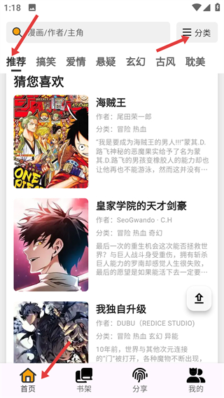 1、在首頁有推薦,搞笑等分類還有猜您喜歡板塊,可直接挑選感興趣的漫畫也能通過搜索欄查找漫畫,作者或主角。