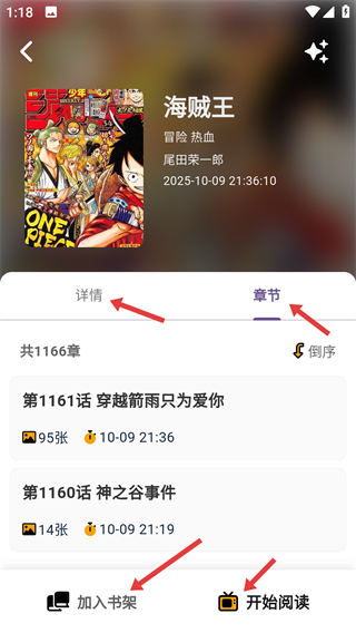 2、找到喜歡的漫畫后可查看詳情和章節(jié),點(diǎn)擊加入書架方便后續(xù)查找點(diǎn)擊開始閱讀即可開始看漫畫。